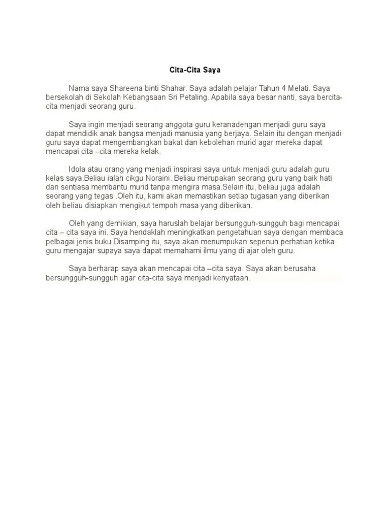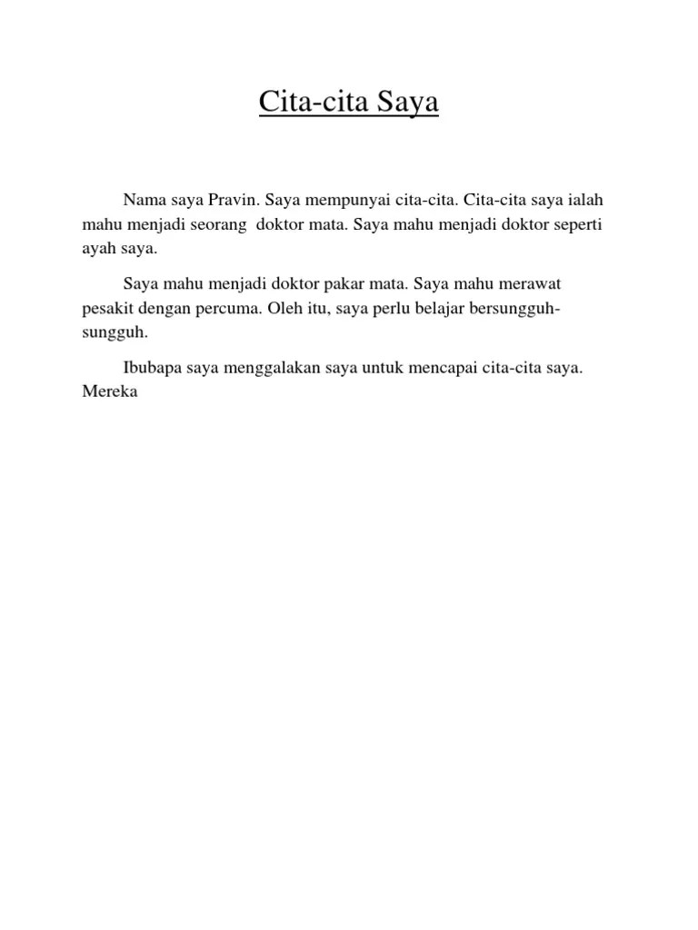 Cita cita saya contoh karangan . Bahasa arab tahun 5 : Ada yang ingin menjadi doktor peguam guru dan sebagainya. Saya merasakan pekerjaan sebagai doktor adalah sangat murni kerana . Saya mula berminat untuk menjadi doktor sejak saya dimasukkan ke hospital setelah melihat. Karangan kerjaya impian saya spm.